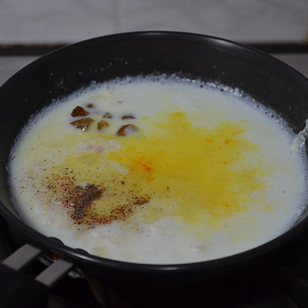 3. Once the garlic is cooked, add palm candy to taste, 1/4 tsp pepper powder and 1/8 tsp turmeric powder. Boil for few minutes till raw smell goes and switch off.