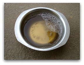 5. Strain and use the liquid to wash your hair. This mixture shown in this picture is very thin and is perfect for washing hair that is not oiled, but for washing oily hair boil till very thick. I usually boil till there is only a few tbsp of the mixture left and it removes oil well. When you boil it till thick the color will be reddish dark brown.