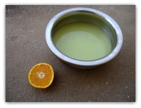 3. Strain the paneer and collect the left over whey water. Add freshly squeezed orange juice to the whey water and your hair rinse is ready!